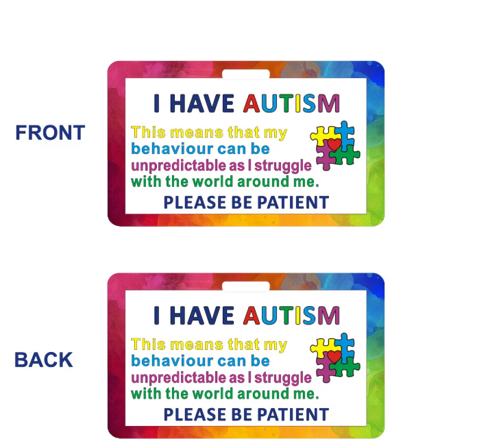 A double-sided autism awareness ID badge with a vibrant rainbow puzzle piece border and blue lanyard. The badge reads 'I Have Autism — This means that my behaviour can be unpredictable as I struggle with the world around me. Please Be Patient.' Perfect for children and adults on the spectrum to communicate their needs in public settings, at school, or during outings. Includes a durable blue lanyard with metal clasp.