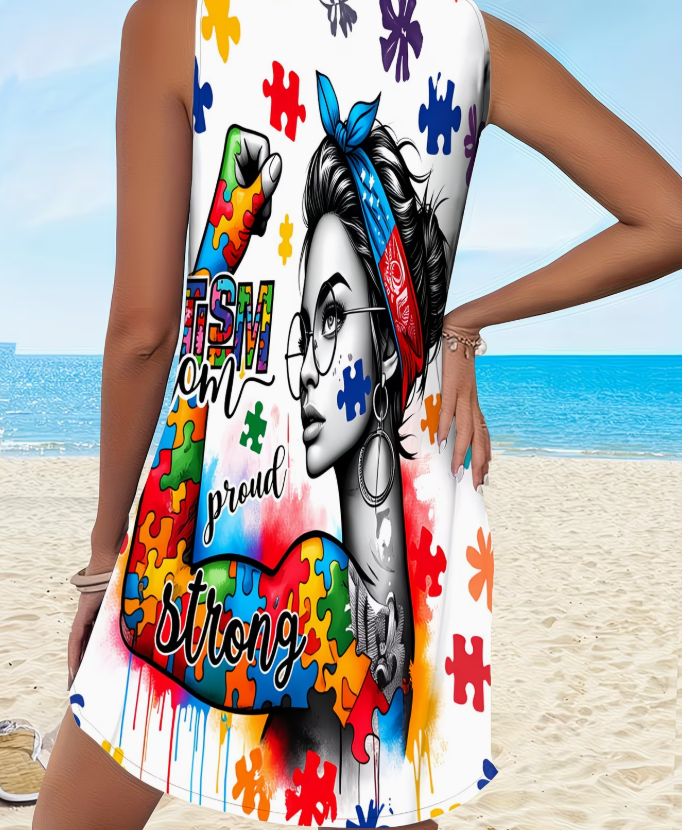 A bold, eye-catching sleeveless dress featuring a powerful illustration of a woman with a puzzle-piece bandana raising her fist, surrounded by colorful autism puzzle pieces and the words 'Autism Mom — Proud, Strong.' This all-over print dress makes a powerful statement of solidarity and strength. Available in sizes 0XL through 5XL.