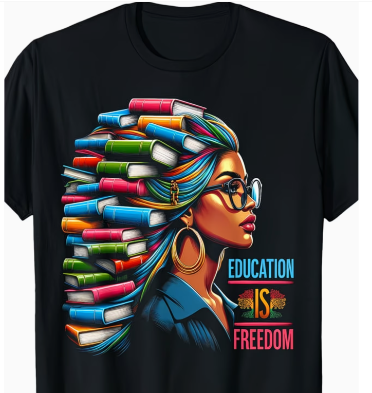 A stunning, vibrant graphic tee celebrating education and empowerment. Features a beautiful illustration of a woman with books woven into flowing, colorful hair and the powerful message 'Education Is Freedom.' A statement piece for educators, students, and advocates.