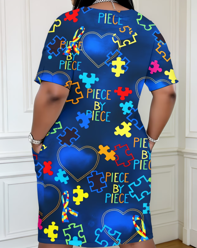 A vibrant, all-over print plus-size V-neck dress featuring colorful puzzle pieces, hearts, autism awareness ribbons, and the empowering message 'Piece By Piece.' This comfortable short-sleeve dress has side pockets and a relaxed fit — perfect for autism awareness events, everyday wear, or making a bold statement. Available in sizes 0XL through 5XL.