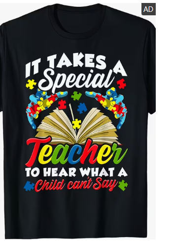 Honor the amazing teachers who make a difference every day. This graphic tee reads 'It Takes A Special Teacher To Hear What A Child Can't Say' with colorful puzzle pieces and book artwork. A heartfelt gift for educators and therapists.